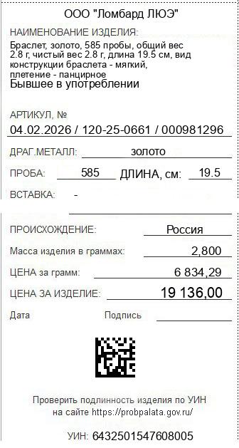 Цена за грамм общего веса: 6834.29Цена за грамм чистого веса: 6834.29Организация: ООО "Ломбард ЛЮЭ"Металл: золотоПроба: 585Артикул: 04.02.2026 / 120-25-0661 / 000981296Базовая единица: шт