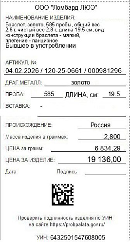 Описание: вид конструкции браслета - мягкий, плетение - панцирноеУИН: 6432501547608005Общий вес: 2.8Чистый вес: 2.8Вес вставок: 0Вид конструкции браслета: МягкийДлина, см: 19.5