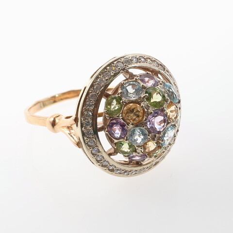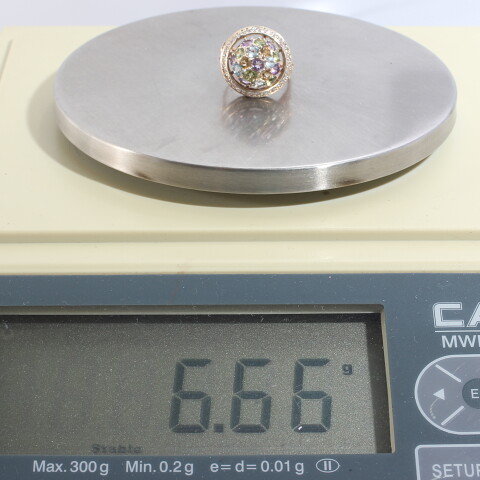 УИН: 6432500553960629Описание вставок: 40 Белых недрагоценных камней,1 Фиолетовый недрагоценный камень,5 Фиолетовых недрагоценных камней,4 Голубых недрагоценных камня,3 Оранжевых недрагоценных камня,5 Зеленых недрагоценных камнейОбщий вес: 6.66Чистый вес: 5.836Вес вставок: 0.824Высота, мм: 11.22Высота шинки, мм: 4.45